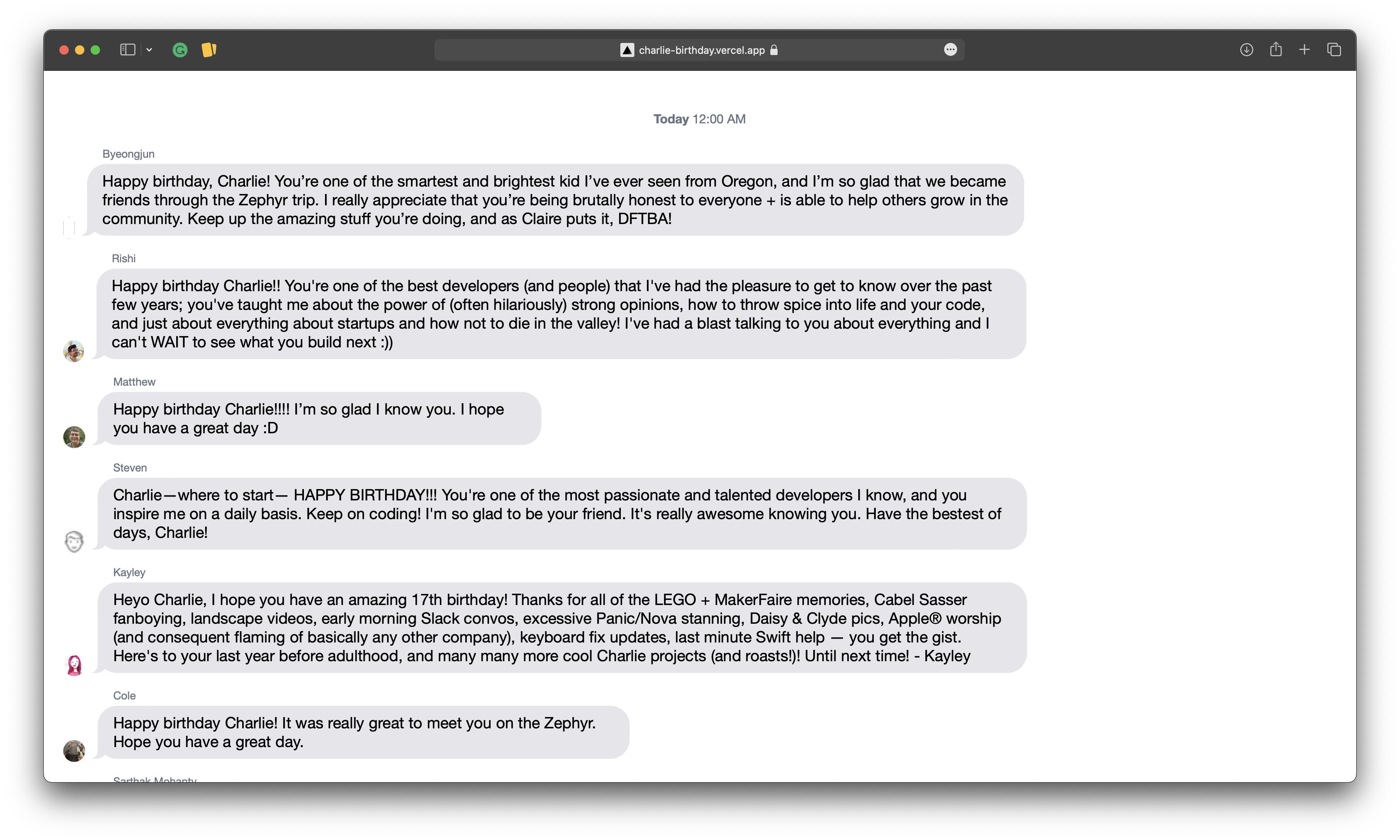 Created a website for a talented iOS engineer's birthday. Used Next.js, Tailwind, and Airtable.