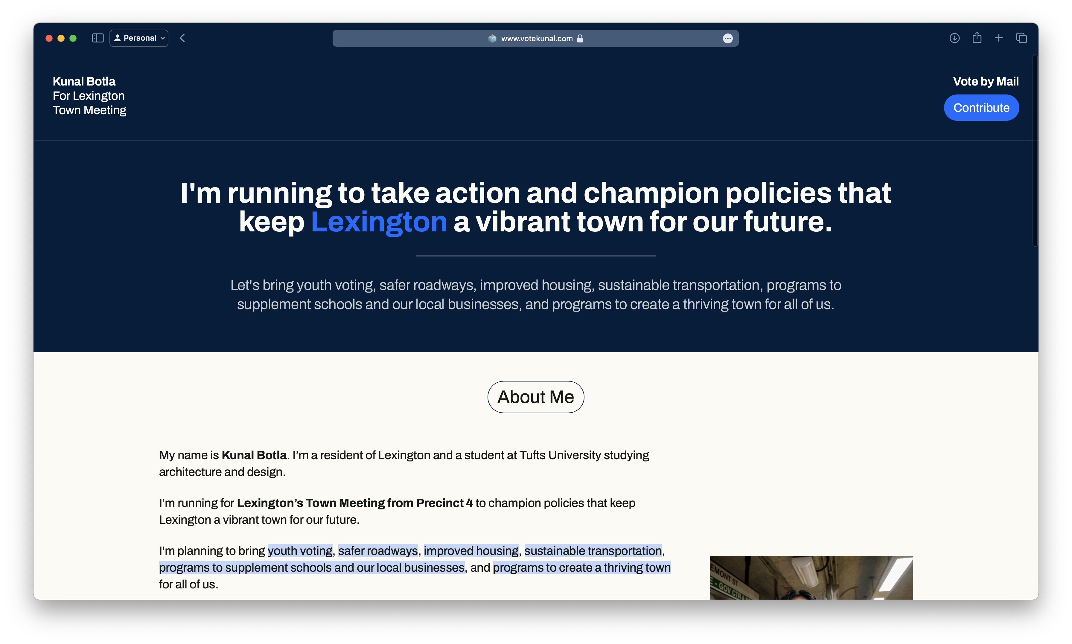 Creating a brand kit and a website for a promising political candidate. Used Next.js and Tailwind.